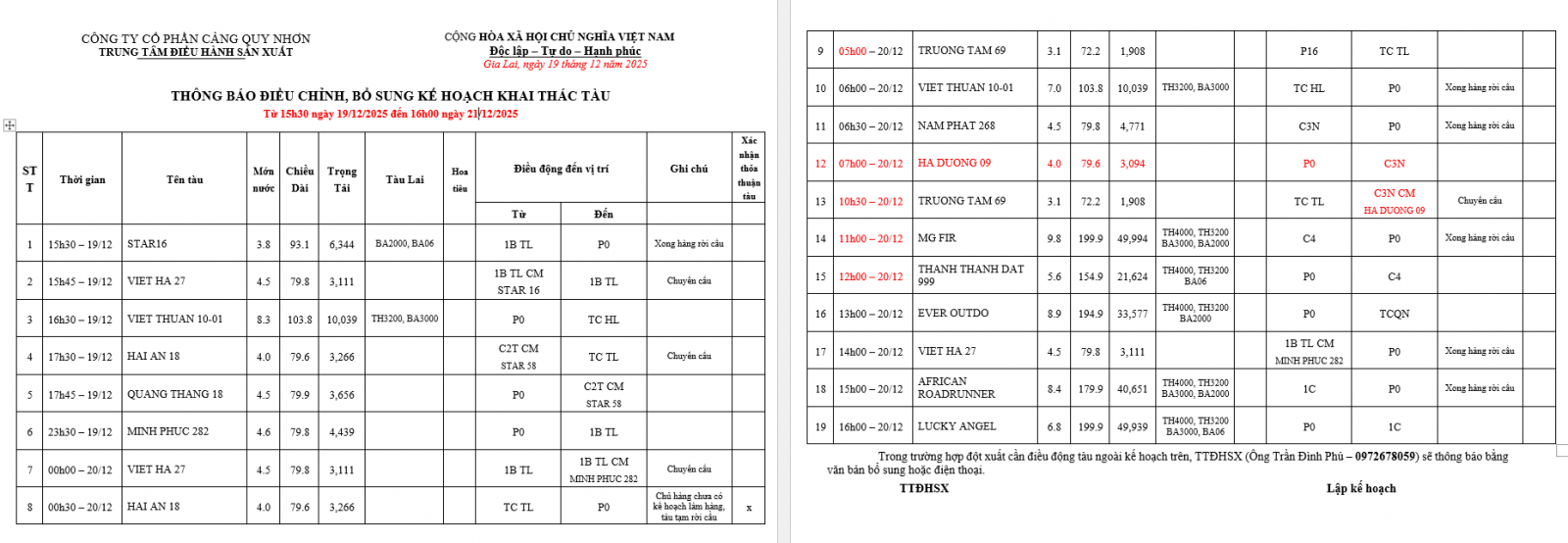 Thông báo điều chỉnh, bổ sung kế hoạch bố trí cầu bến (16h 19.12.2025 -16h 21.12.2025)