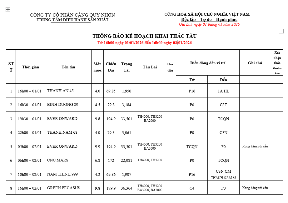 Thông báo kế hoạch bố trí cầu bến (16h 01.01.2026 -16h 03.01.2026)
