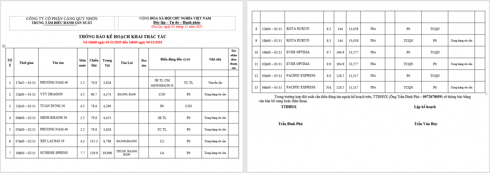 Thông báo kế hoạch bố trí cầu bến (16h 01.11.2025 -16h 03.11.2025)