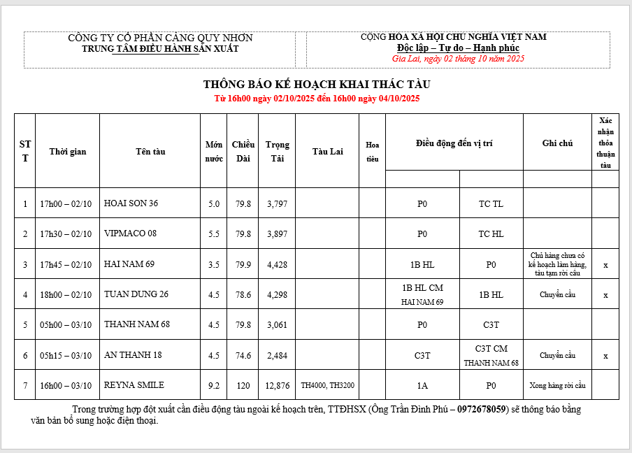 Thông báo kế hoạch bố trí cầu bến (16h 02.10.2025 -16h 04.10.2025)