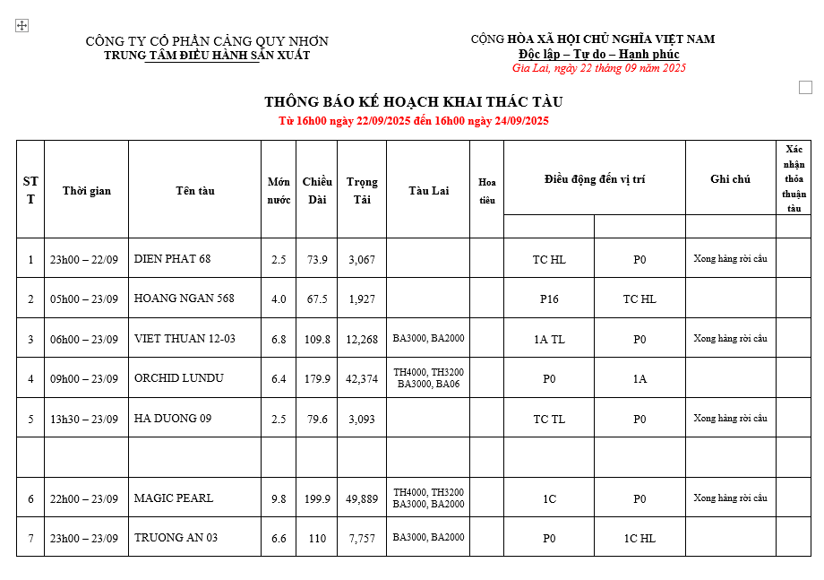 Thông báo kế hoạch bố trí cầu bến (16h 22.09.2025 -16h 24.09.2025)