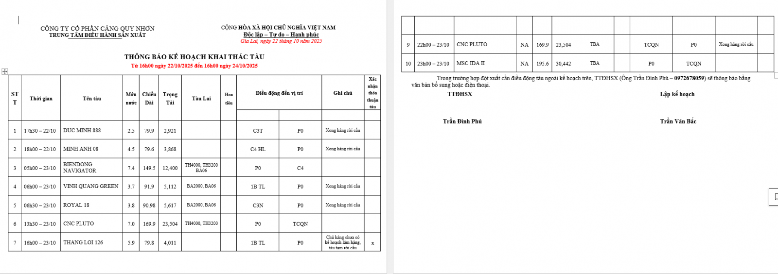 Thông báo kế hoạch bố trí cầu bến (16h 22.10.2025 -16h 24.10.2025)