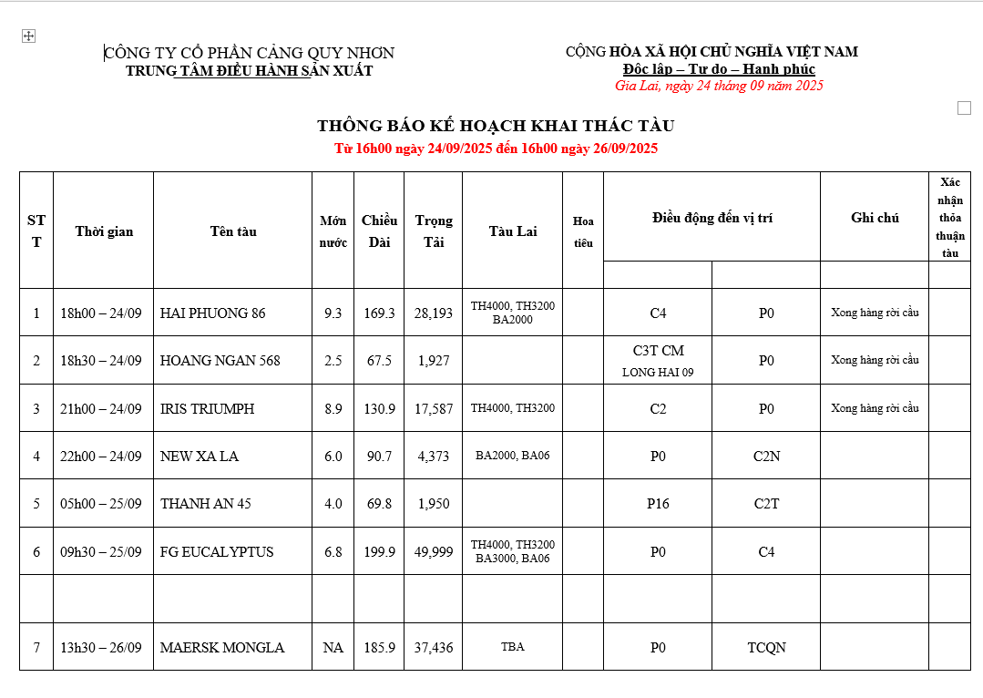 Thông báo kế hoạch bố trí cầu bến (16h 24.09.2025 -16h 26.09.2025)