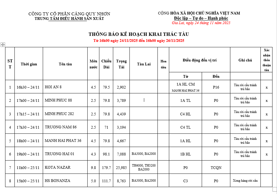 Thông báo kế hoạch bố trí cầu bến (16h 24.11.2025 -16h 26.11.2025)