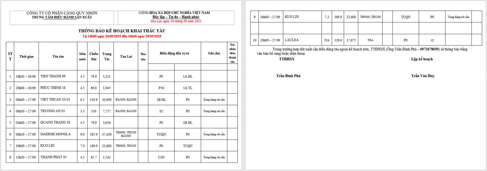 Thông báo kế hoạch bố trí cầu bến (16h 26.09.2025 -16h 28.09.2025)