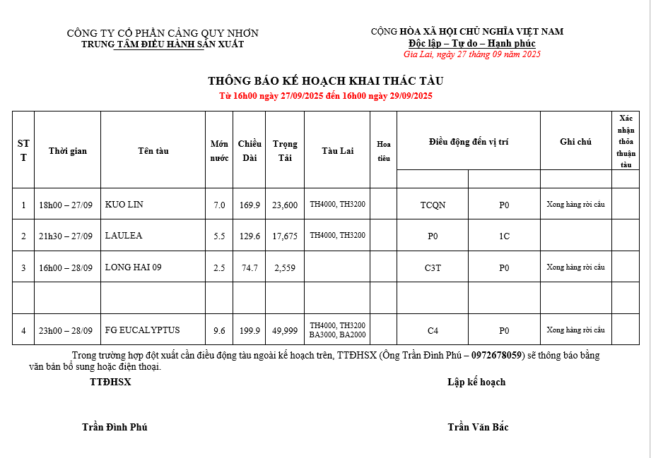 Thông báo kế hoạch bố trí cầu bến (16h 27.09.2025 -16h 29.09.2025)