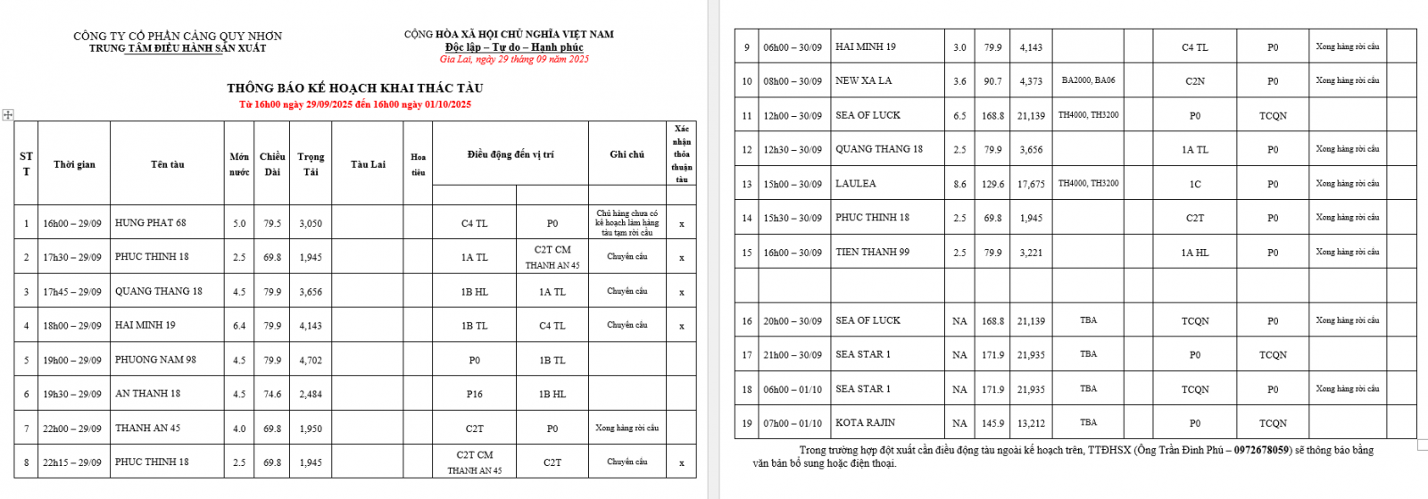Thông báo kế hoạch bố trí cầu bến (16h 29.09.2025 -16h 01.10.2025)