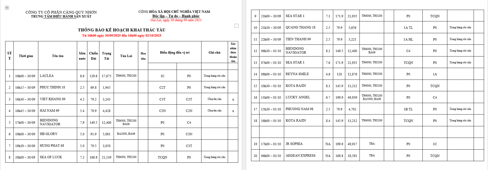 Thông báo kế hoạch bố trí cầu bến (16h 30.09.2025 -16h 02.10.2025)